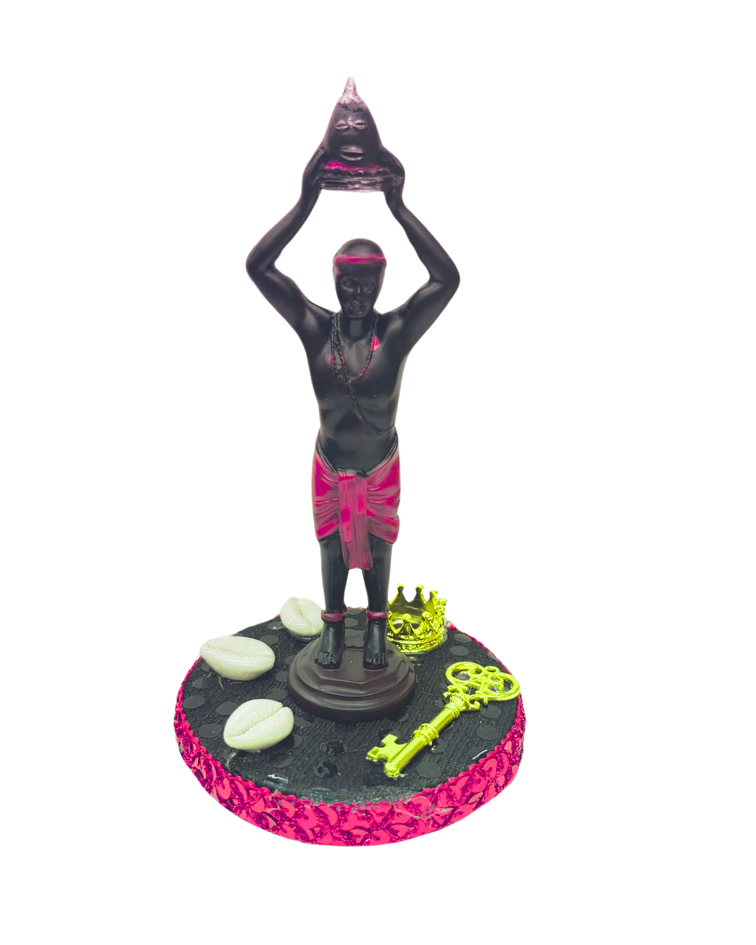 This Decorated Eleguá Statue is a spiritually charged figure dedicated to Eleguá, the powerful Orisha of the crossroads, doors, and destiny. As the guardian of all paths and the first to be honored in any ritual, Eleguá opens or closes the way depending on one's alignment with truth and purpose.