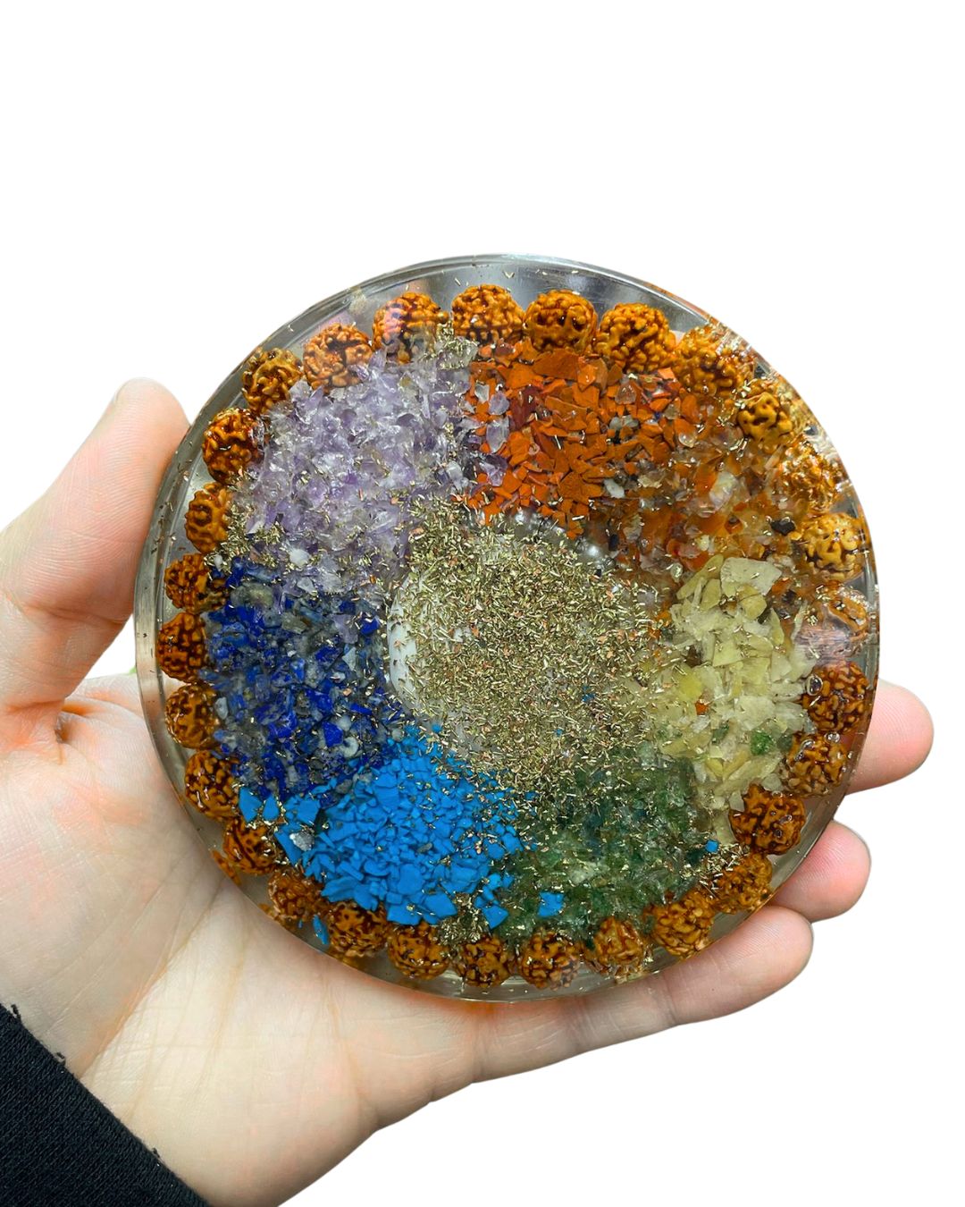 The Seven Chakra Orgone Healing Coaster is a multifunctional spiritual tool infused with natural resin, metal shavings, and seven chakra stones. Each layer corresponds to one of the body’s energy centers, working to balance, align, and energize your aura while protecting against negative frequencies and EMFs.