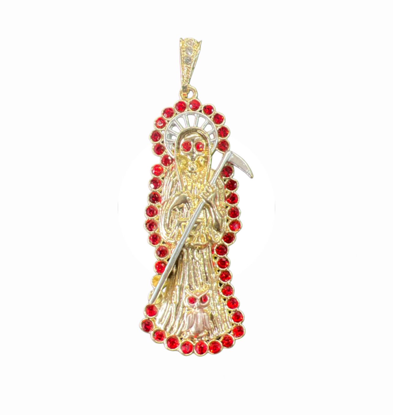 The Sta Muerte/Holy Death Pendant is a powerful symbol of protection, strength, and transformation. Crafted in gold-filled material and adorned with red accents, this pendant represents the balance between life, death, and rebirth, offering spiritual guidance and resilience.